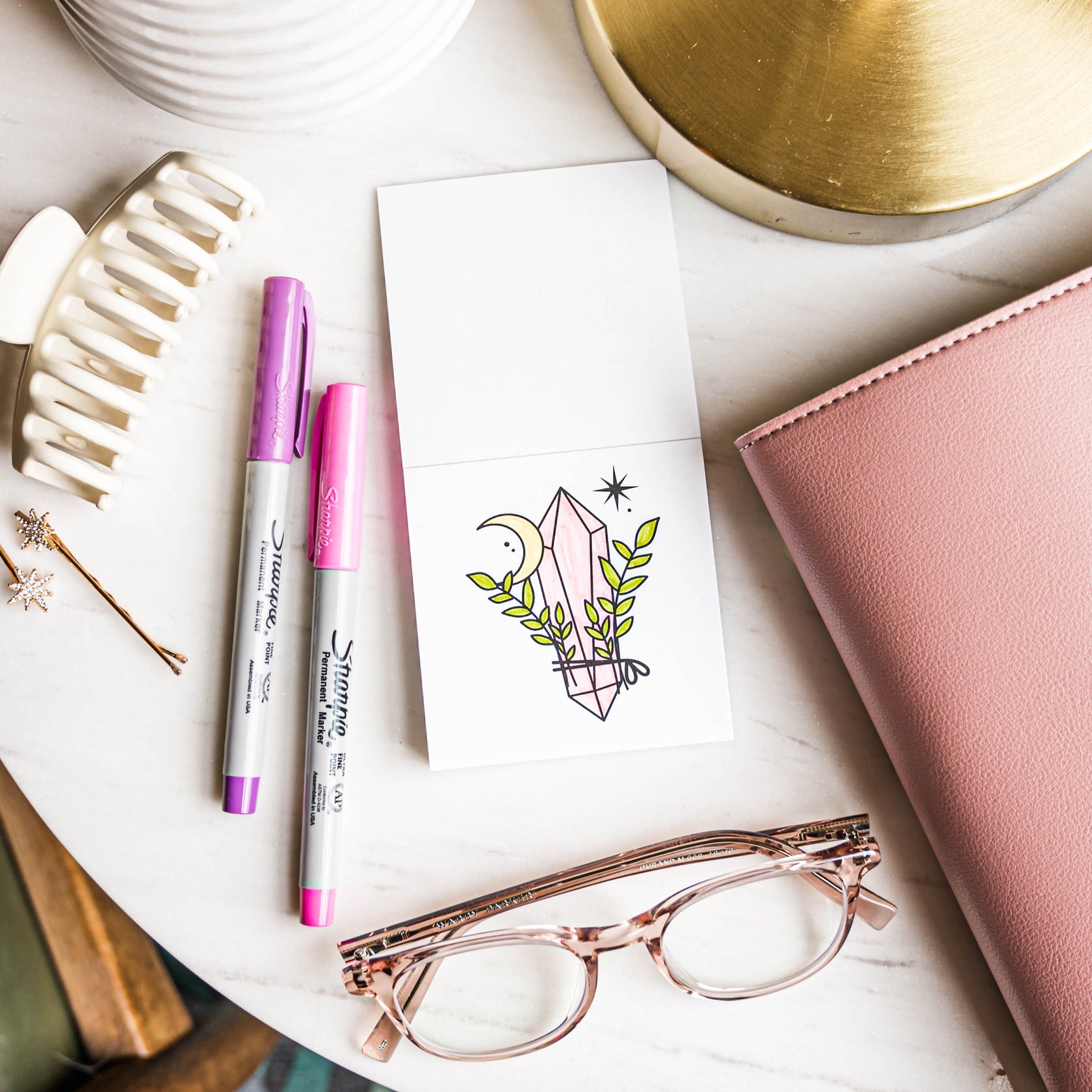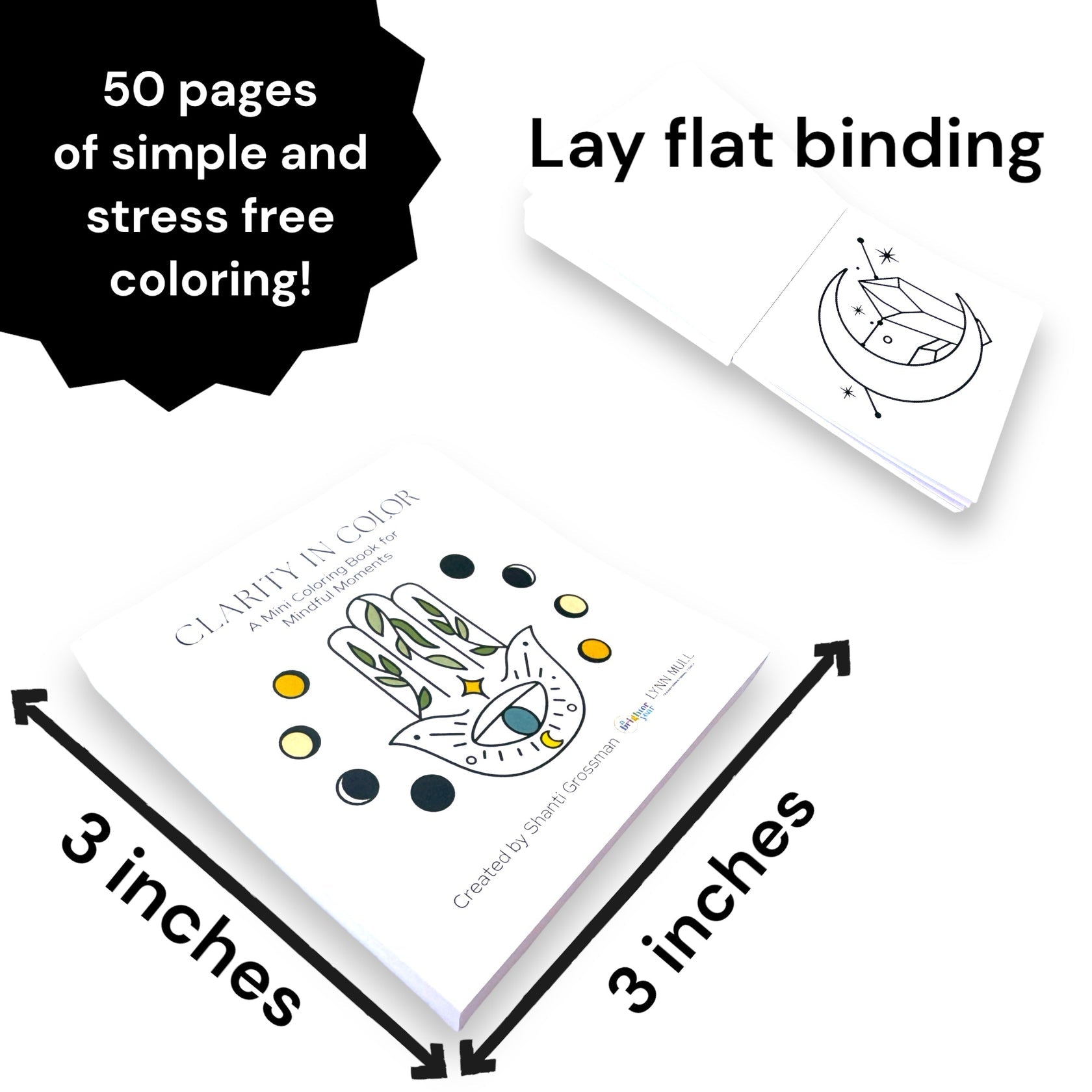 This compact 3x3 inch book, a collaboration between A Brighter Year and transformational coach Lynn Mull, features intricate designs of chakras, yoga poses, moons, crystals, and inspiring words. Ideal for adults and loved by children, each page offers a quick, rejuvenating coloring experience.