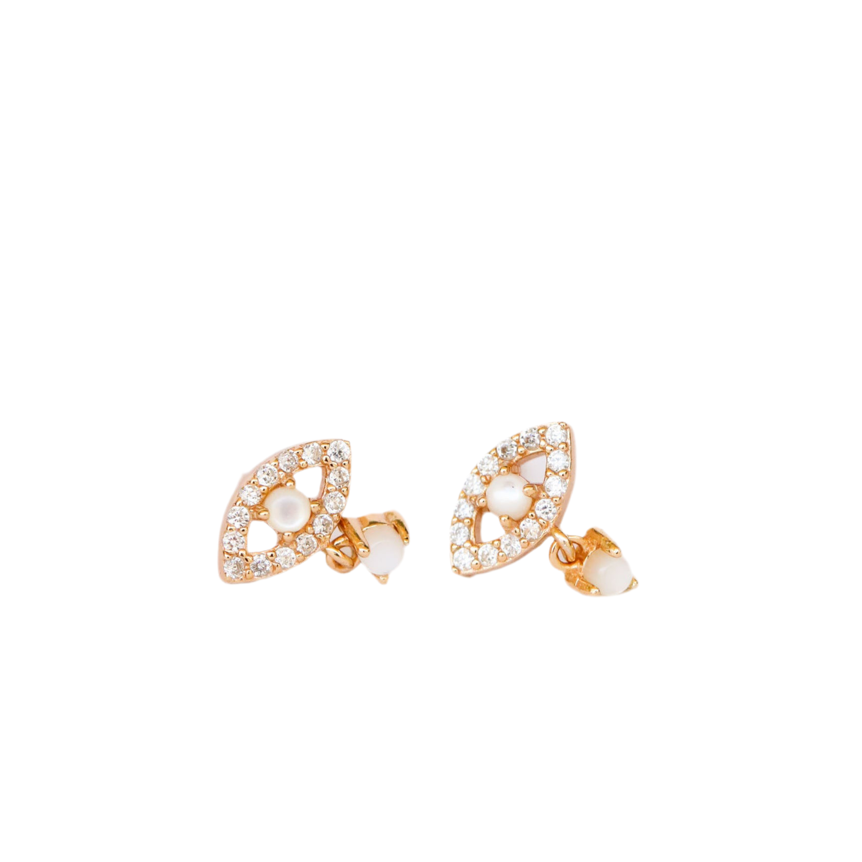 A CZ encrusted evil eye guards against misfortune while bringing good luck to the wearer. A delicate drop of bright Mother of Pearl helps relax and soothe. Natural stones will show variation in tones and color, they are sisters not twins.