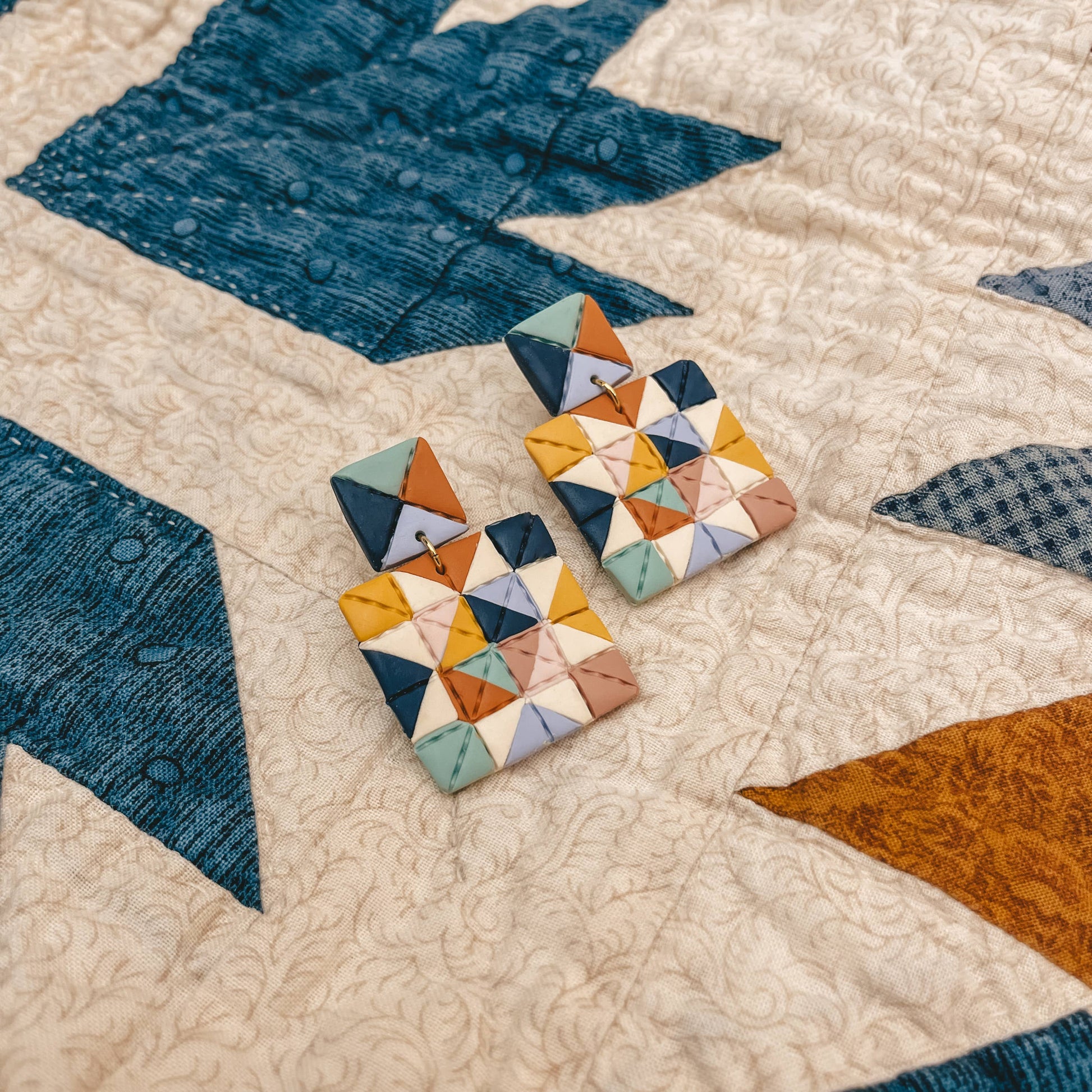 Quilted Style Stud Dangle Polymer Clay Earrings | Confetti Block