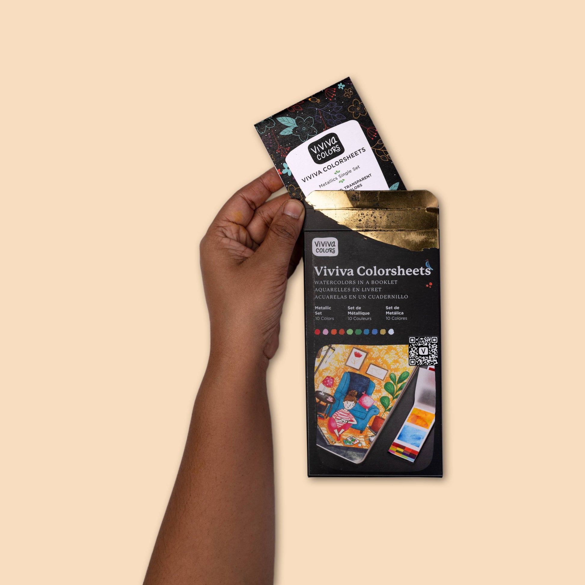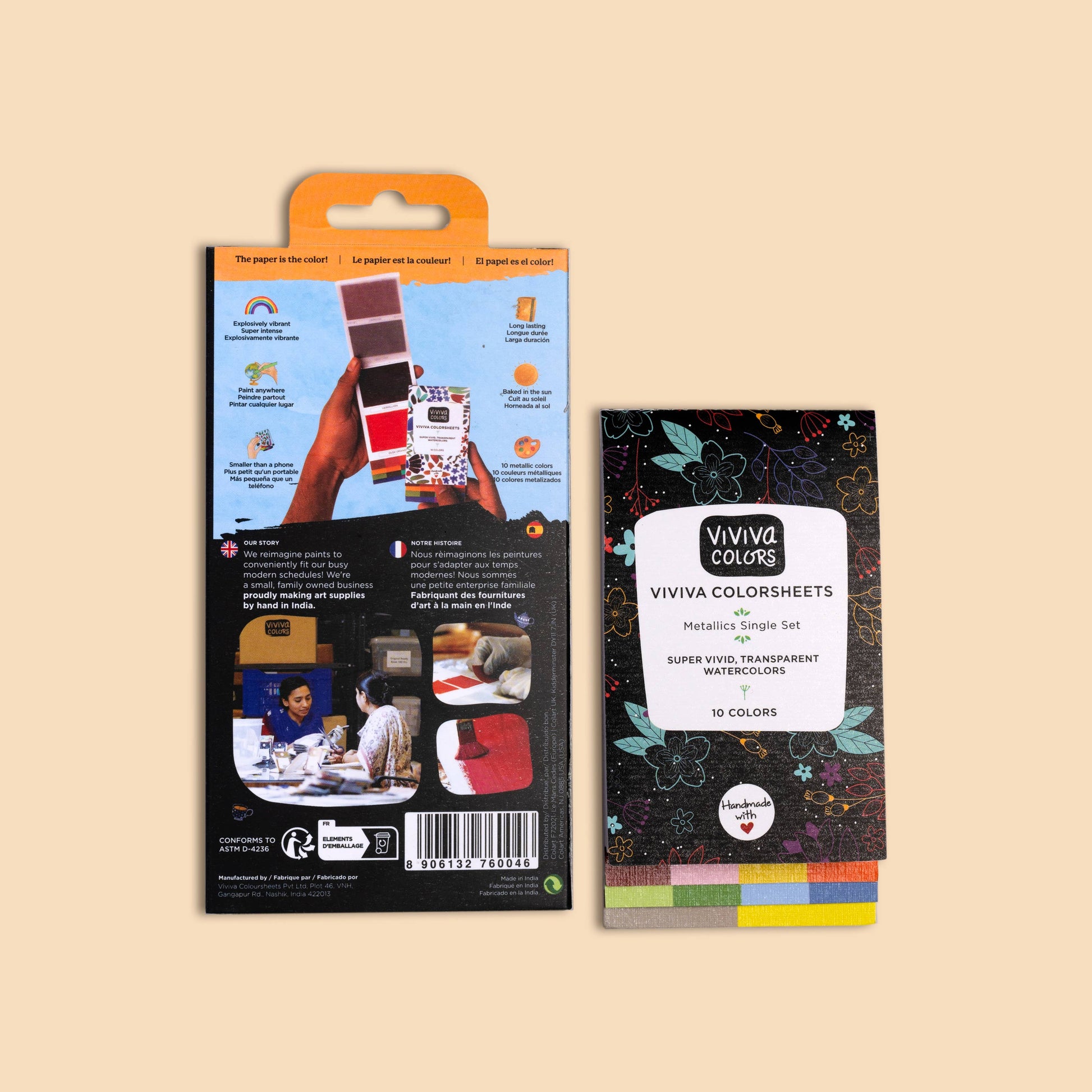 The Metallics Colorsheets is an exquisite collection of transparent metallics that leave behind a subtle glitter texture on drying. What is Transparent Metallics? Usually, metallic colors are found opaque but Viviva Metallics are transparent which means the colors blend & mix easily with each other. As a result, you may do an entire painting with Metallics & not just limit them for highlights!